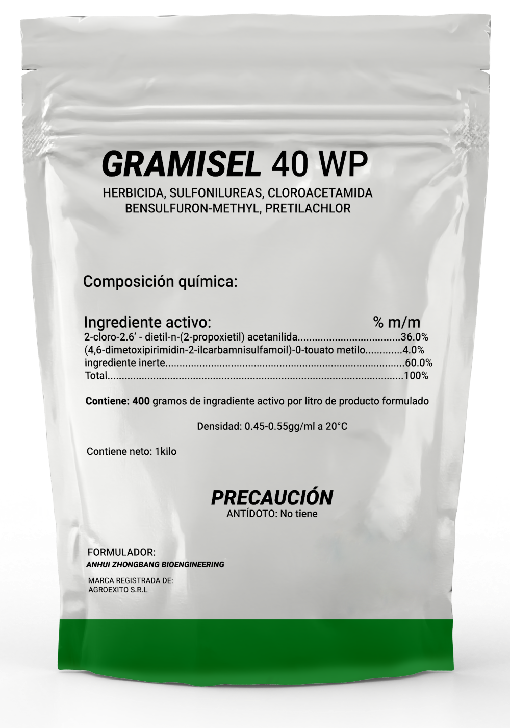 GRAMISEL 40 WP, es un herbicida Preemergente recomendado para el control de malezas en el cultivo de arroz. Compuesto por dos ingredientes activos Pretilaclor + Bensulfuron metil. Envanse: 1 Kilogramos Dosis: 2 kilogramos por Hectarea.
