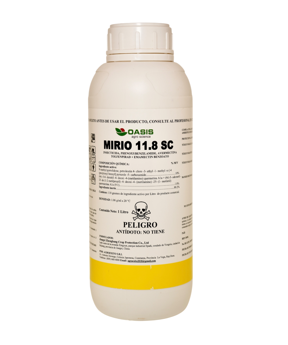MIRIO 11.8 SC Es un producto que tiene un alto efecto de control sobre todo tipo de insectos y ácaros de quirópteros, hemípteros, escarabajos, himenópteros y dípteros. También tiene un notable efecto en el control sobre trips. Envanse: 250 CC, 1 Lt, Dosis: de 0.5 a 1 litros por Hectarea.