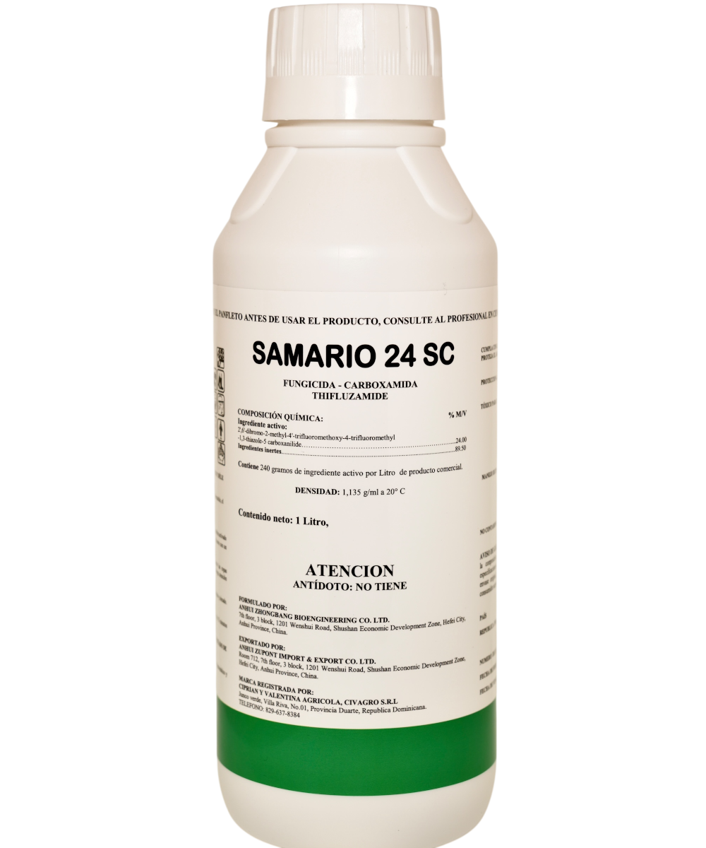 SAMARIO 24 SC, es un fungicida sistemico, traslaminar, con actividad preventiva y curativa frente a varias especies de hongos, impide la acción de la enzima succinato-deshidrogenasa del ciclo del ácido tricarboxilico de los hongos. En aplicaciones foliares el producto también es absorbido por las hojas y se moviliza hacia los puntos de crecimiento. cultivos recomendados arroz, papa, platano y guineo. Envanse:1 Lt, Dosis: de 0.5 a 1 litros por Hectarea.